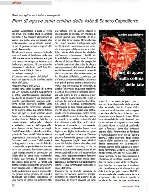 Ancora una volta l´autore di "Storie da un sogno", Sandro Capodiferro ci offre un'interessante opportunità: quella di compiere un seducente quanto approfondito viaggio all'interno dell'io interiore, questa volta esclusivamente femminile, attraverso le pagine della sua ultima fatica: Fiori di agave sulla collina delle fate. Le protagoniste sono appunto due donne: Adele e Felicita. La prima, Adele, dedita alla costante e sofferta ricerca dell'imprendibile e diverso da lei, l'uomo o meglio l'entità' maschile, così nel suo intimo quanto la "non realtà" che lei stessa rappresenta, attraverso le pagine del "romanzo nel romanzo" del quale e' protagonista tra le mani di Felicita. La seconda, appunto Felicita, immersa in un contesto familiare costruito sugli insegnamenti e permeato dei valori che le sono stati tramandati dalla sua famiglia di origine che, per ironia della sorte, la rende allo stesso tempo fatalmente prigioniera di un quadro che lei stessa ha contribuito a dipingere colore dopo colore, giorno dopo giorno. Un quadro destinato ad essere ripensato, in una sorta di pittorico pentimento, dall'artista che lo aveva ideato e idealizzato: sé stessa. Un mondo di donne quindi alla scoperta di sé e di ciò che le circonda. Un'esistenza "in rosa" spesso trasfigurata agli occhi di molti uomini come un mondo incomprensibile e imperscrutabile, viene delicatamente rivelata dall´autore attraverso i tratti vibranti della sua narrazione. E' in una chiave di lettura libera da pregiudizi e limiti sensoriali che si ha la chiara consapevolezza del vivere delle due entità femminili attraverso i racconti che Adele narra del suo passato e le riflessioni di Felicita scambiate con un´ amica di nome Rachele. Un´amica non più di penna come si usava una volta, ma conosciuta in internet. E' anche l'alternarsi di questo moderno e antico che rende il romanzo surreale agli occhi di chi lo esplora e per altri aspetti modernamente reale e oscuro. Le storie di queste due donne, Adele e Felicita, compongono l´immagine di due mondi apparentemente diversi ma grazie alla sottile realtà che li accomuna, molto simili e soprattutto vicini. Entrambe hanno un marito che, nella profondità del loro diverso e alla fine molto simile modo di amarle, o non amarle, le accomuna; entrambe hanno una figlia e un figlio, entrambe scoprono quel qualcosa di sé che l` intimo pudore femminile spesso cela sotto vesti leggere e fragili come petali di rose di cristallo. Oserei dire che, mai come in questo romanzo, si ha la strana e piacevole sensazione di riconoscersi nella storia di queste due vite, solo apparentemente lontane dal fantastico dei nostri stessi pensieri ma al contempo incredibilmente vicine: una l´immagine nascosta e reale dell'altra. L'autore ha la grande capacità di darci la sensazione, anziché semplicemente di leggere le pagine di un romanzo, di essere davanti ad uno specchio che svela le parti nascoste di chi protagonista della propria vita in realtà non lo è mai stato come anche di fornire un'immagine speculare dell'io femminile in continua e instancabile evoluzione. Al lettore viene data la particolare ed unica occasione di vagare in una serie di eventi dove la realtà si confonde con la fantasia, dove due antitetici aspetti della femminilità si fondono e materializzano in un unico "essere donna" nello scorrere degli eventi narrati dallo scrittore con sorprendente attenzione nel valorizzare i diversi aspetti delle capacità e sensibilità femminili. Lì dove le realtà dei nostri tempi riflessa nel ruolo dell´amica Rachele fa da voce narrante e riflessiva, lo scrittore Sandro Capodiferro dona ad una delle protagoniste, Felicita, la capacità di rivelare, più che all'amica a sé stessa, i propri dubbi e le proprie paure. Nell'illusione creata da questa meta-lettura scopriamo vite di donne pronte a tendersi le braccia per sostenersi nel loro viaggio alla scoperta di ciò che diversamente non avrebbero mai avuto il coraggio di esplorare e riconoscere di sé. Braccia elegantemente ricoperte da guanti di velluto pronte a proteggersi. Ciò che colpisce alla fine della storia e ci accompagna in tutta la narrazione è la sorprendente capacità che rivela lo scrittore di saper descrivere i pensieri e le immagini femminili come difficilmente ci si poteva attendere da un uomo. Non è solo il contenuto della storia in sé per il quale il romanzo vale la pena di essere letto, ma soprattutto per la costante ricchezza di sensazioni e scoperte dell´animo e del pensiero femminile che lo scrittore in questo romanzo ha saputo mettere in risalto con accurata eleganza. È raro riconoscere in un uomo che scrive un romanzo di donne il coraggio e la raffinatezza di saper descrivere le parti oscure del mondo femminile. In Fiori di agave sulla collina delle fate, l'autore Sandro Capodiferro ha saputo raggiungere con discrezione e profonda sensibilità anche questo traguardo.